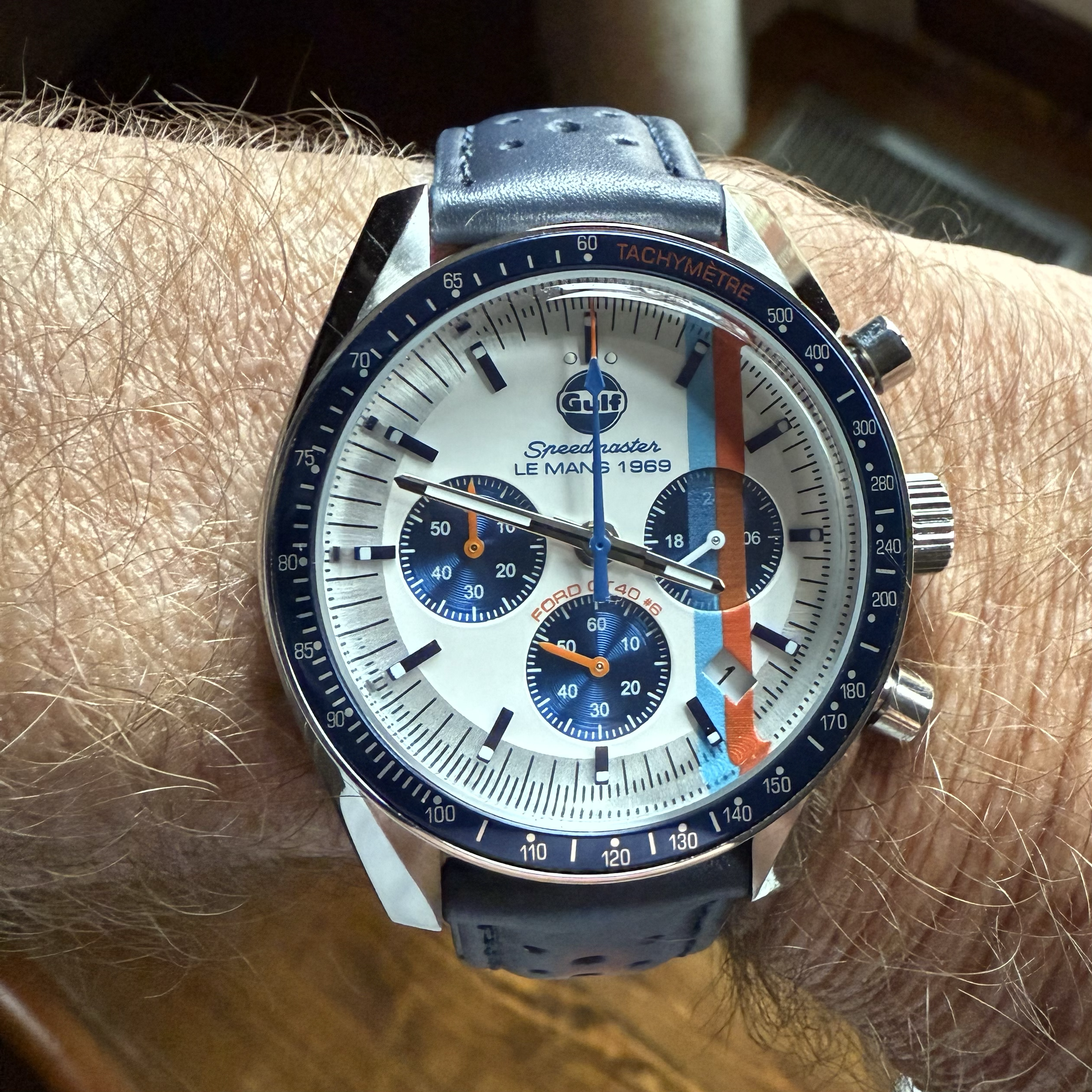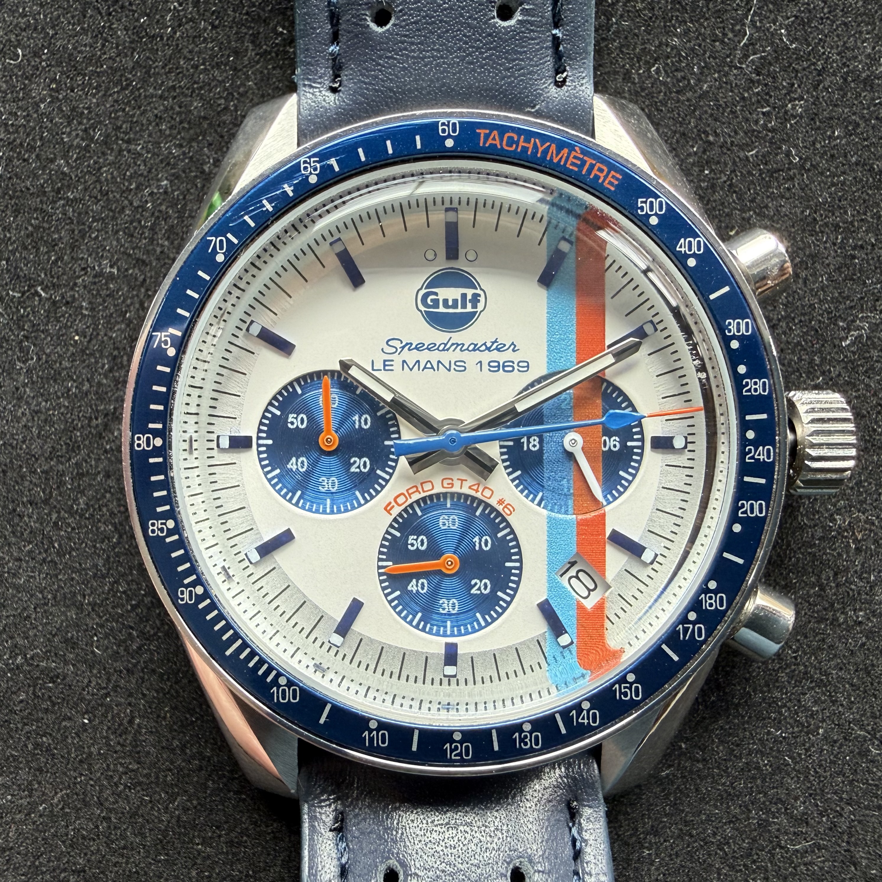 I was thrilled with my custom Cobra watch that inspired me to design a GT40 themed watch. The Ford GT40 racing program is nothing short of legendary. Among all the racing liveries, the Gulf remains my all-time favorite. While many are familiar with the Ford GT40 story through the movie Ford vs. Ferrari and the remarkable 1-2-3 finish in 1966, the victory in 1969 was equally impressive.